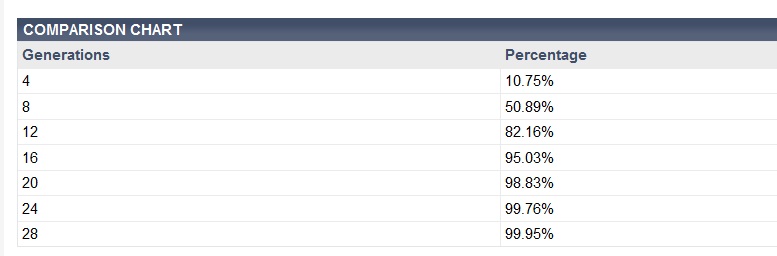 Checking Family Tree DNA’s chart for 7 and 8 generations, that percentage or probability is 20% and 27% respectively.