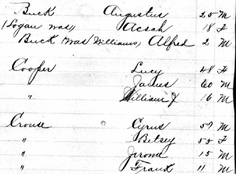 And just think, if you are Alfred’s great-grandson and you took the Yline DNA paternal line test, expecting to match a Buck, and you were instead matching a Williams, Hogan or Logan, and if you never saw this census page, you would have no clue as to potentially why. Of course, if you aren’t matching a Buck or a Logan, Hogan or Williams, then all bets are off. But at least, there is a clue here that something is not like the rest of the families recorded in the census. It’s something to work with.