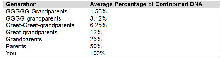 In the statistical world of DNA, on the average, we believe that each generation receives roughly half of the DNA of the generations before them. We know that each child absolutely receives 50% of the DNA of both parents, but how the grandparents DNA is divided up into that 50% that goes to each offspring differs. It may not be 50%. I am in the process of doing a generational inheritance study, which I will publish soon, which discusses this as a whole.