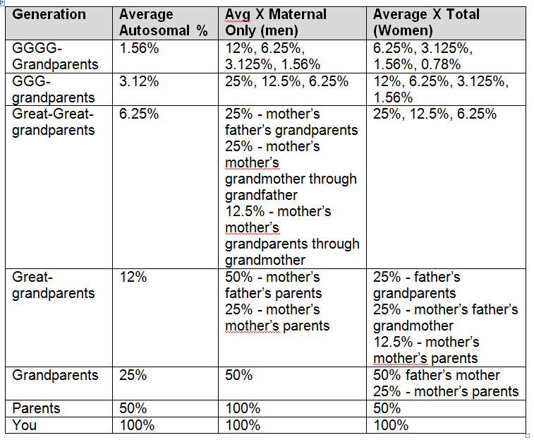 Please note Blaine Bettinger’s X maternal inheritance chart percentages from his “More X-Chromosome Charts” article, and used with his kind permission in the X Marks the Spot article.