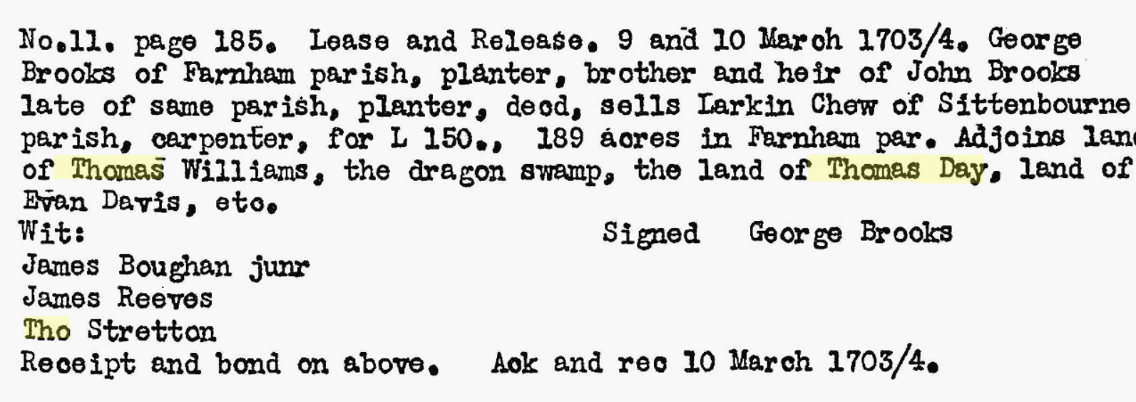 5 Dec 1705 signed Tho x Day Wit: John Fargason Wm. aylett Adam Denning Ack and rec 11 Feb 1705/6