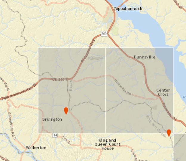 We find his land on the map below, in the area in gray, in essence between the two orange balloons in Essex County, on Dragon Swamp, also known as Dragon Run. This was an area where the Indians used to hide.