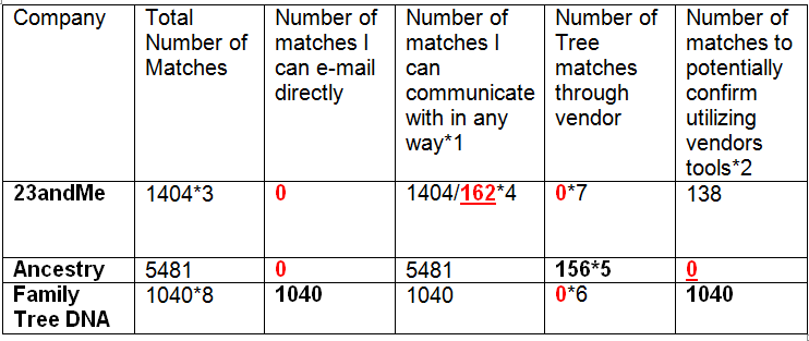 *1 – Both 23andMe and Ancestry provide communications with others whom you match through internal message systems. However, you have to request permission at 23andMe with anyone you match to communicate with them, and then additionally to share their DNA. The 23andMe the 1404 number is how many people I match and the 162 number is the number of people that have accepted communications from me. Not all of those 162 are sharing DNA.