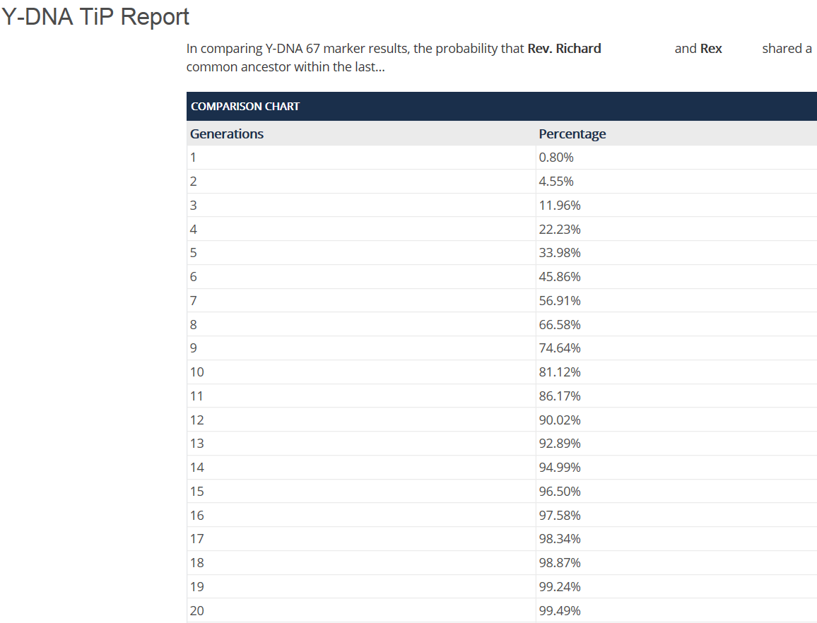 The TIP calculator shows us that, based on their mutations at 67 markers, these two men are most likely to be related between 6 and 7 generations. At the 50th percentile, they are as likely to be related sooner as later, so the 50th percentile is the number I tend to use for an estimate of the distance to the most recent common ancestor.