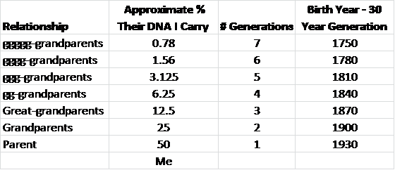 First, your DNA is divided in half with every generation, meaning that you will, on the average, inherit roughly half of the DNA of your ancestors. Now in reality, half is an average and it doesn’t always work that way. You may inherit an entire segment of an ancestor’s DNA, or none at all, instead of half.