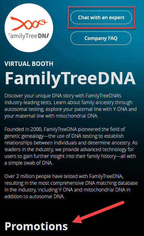 • First, vendors will have sales. Note that “Promotions” word in the FamilyTreeDNA booth, below.