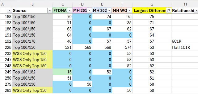 - Top 100/150 – The first group of matches, other than the above categories, were the top 100 matches using the FamilyTreeDNA 2016 kit, which was my first test at MyHeritage. All tests continue to accumulate matches over time, so it just made sense to start here.
