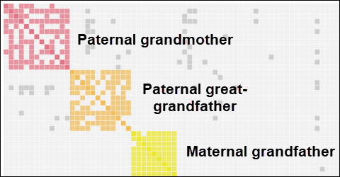 On the left-hand (blue) side of this graphic, we see four siblings that descend through their father from Great-grandpa who contributed that large magenta segment of DNA. That segment becomes reduced in descendants in subsequent generations.